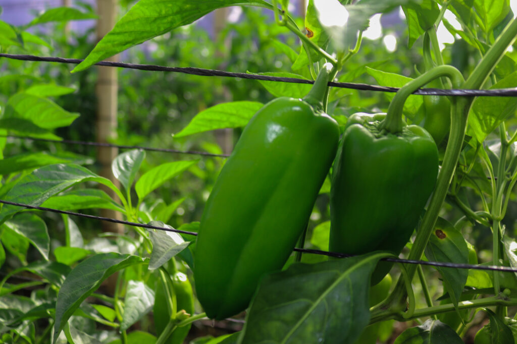 El cuarto rubro que ha incorporado es el chile dulce en un macrotúnel de 2.5 m de alto, por 10 m de ancho y 18 m de largo con su respectivo sistema de riego, al igual que en todos sus cultivos. Sembró 400 plantas de chile dulce variedad Nataly, también en octubre pasado, y lo está vendiendo por jabas.