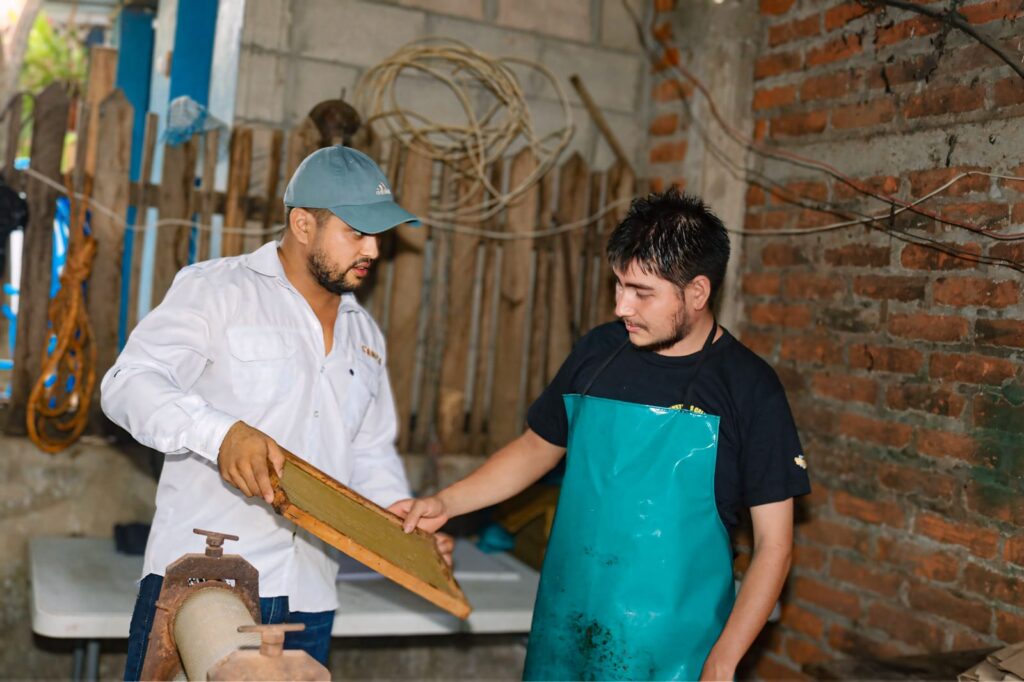 Wilmar Genovez, especialista de la agencia CENTA Quezaltepeque que lo asiste técnicamente, explica que el apicultor también elabora láminas de cera estampada, que son de vital importancia para la tecnificación de las colmenas, pues en la actualidad a la gran mayoría les falta aprender e incorporar estas técnicas para mejorar sus producciones. Al hacerlo de forma artesanal lo que se hace es exprimir los panales de miel, no siendo posible reutilizarlos, si hicieran un buen manejo se tendría un mayor aprovechamiento de estos.