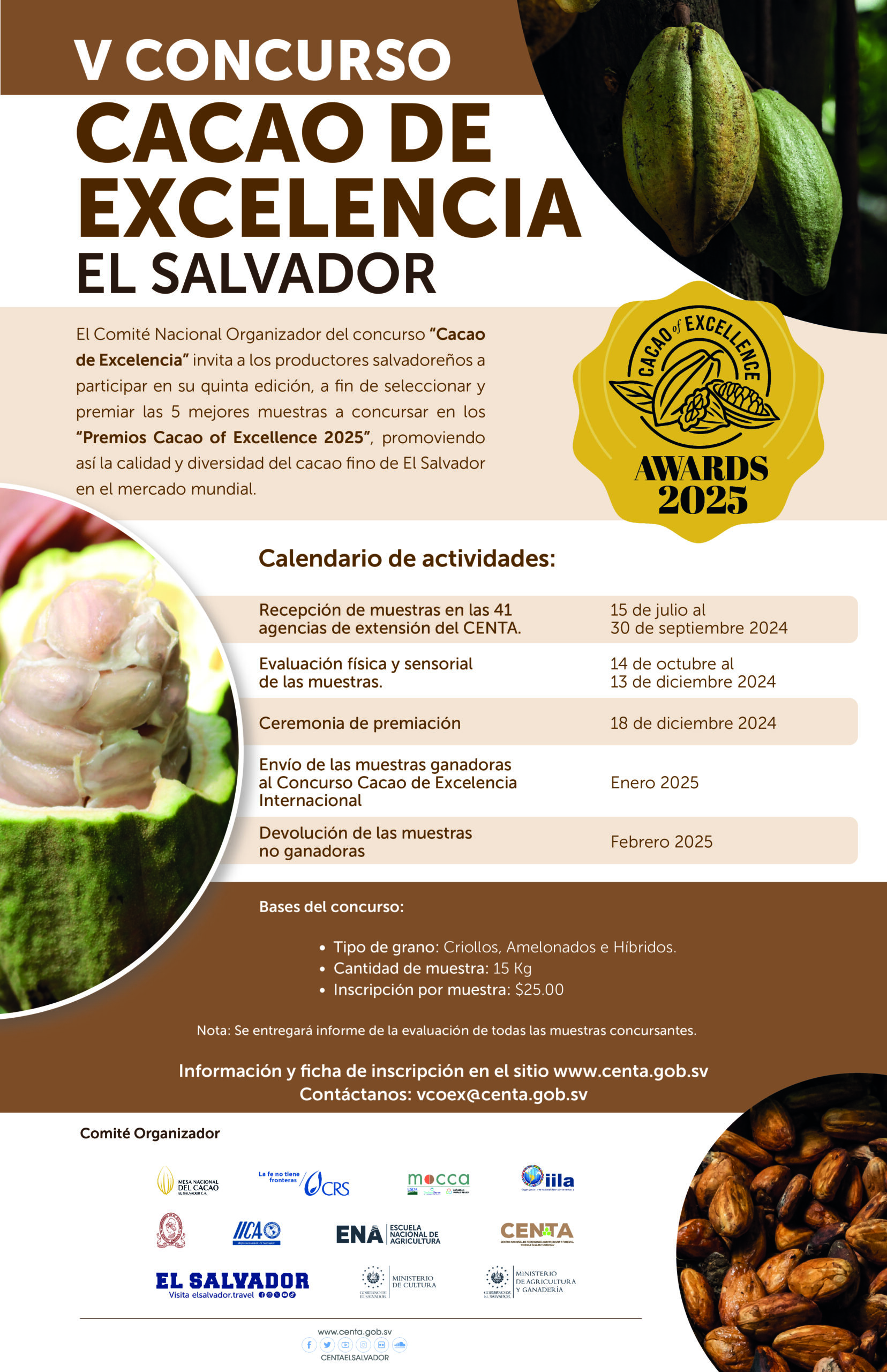 El Comité Nacional Organizador del concurso “Cacao de Excelencia”, invita a los productores salvadoreños a participar, a fin de seleccionar y premiar las 5 mejores muestras a concursar en los Premios “Cacao of Excellence 2025”, promoviendo así la calidad y diversidad del cacao fino de El Salvador en el mercado mundial.